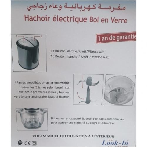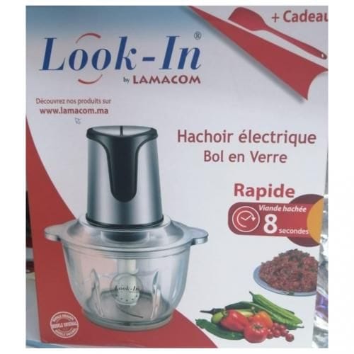 Lamacom Hâchoir électrique 300W avec bol en verre 2 litre -2 vitesses pour tout les aliments + CADEAU